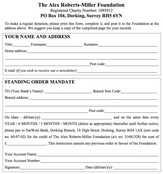 To donate by post, please make cheques payable to "The Alex Roberts-Miller Foundation" and send it to: The Alex Roberts-Miller Foundation, P.O. Box 104, Dorking, Surrey RH5 6YN.